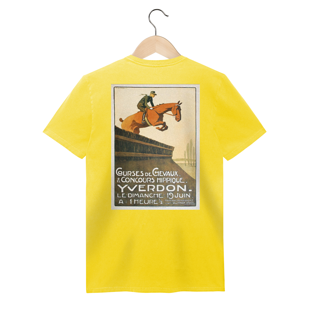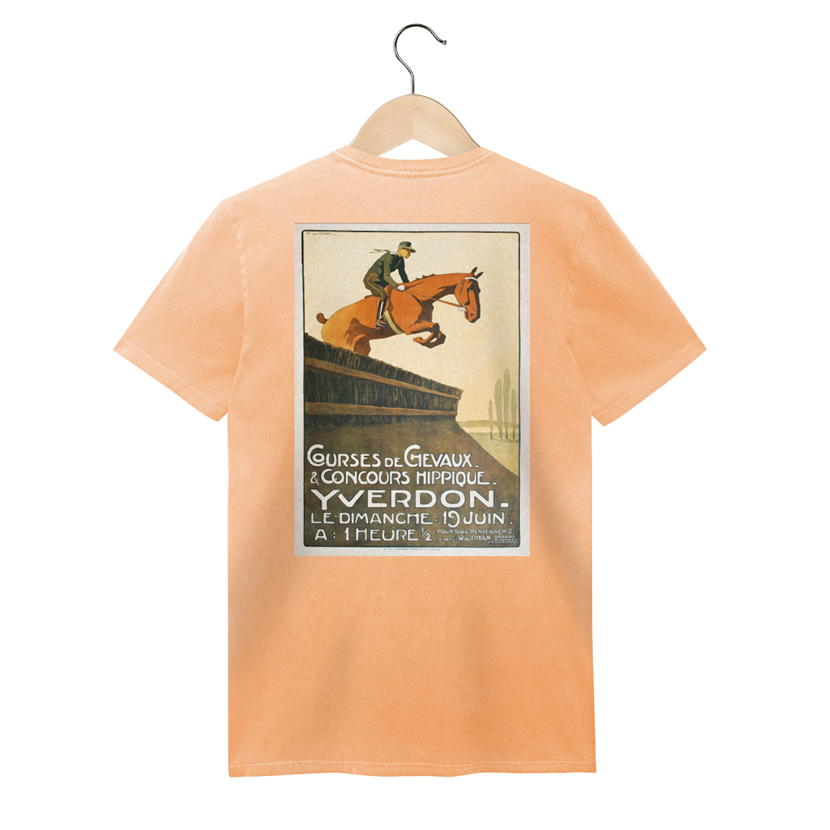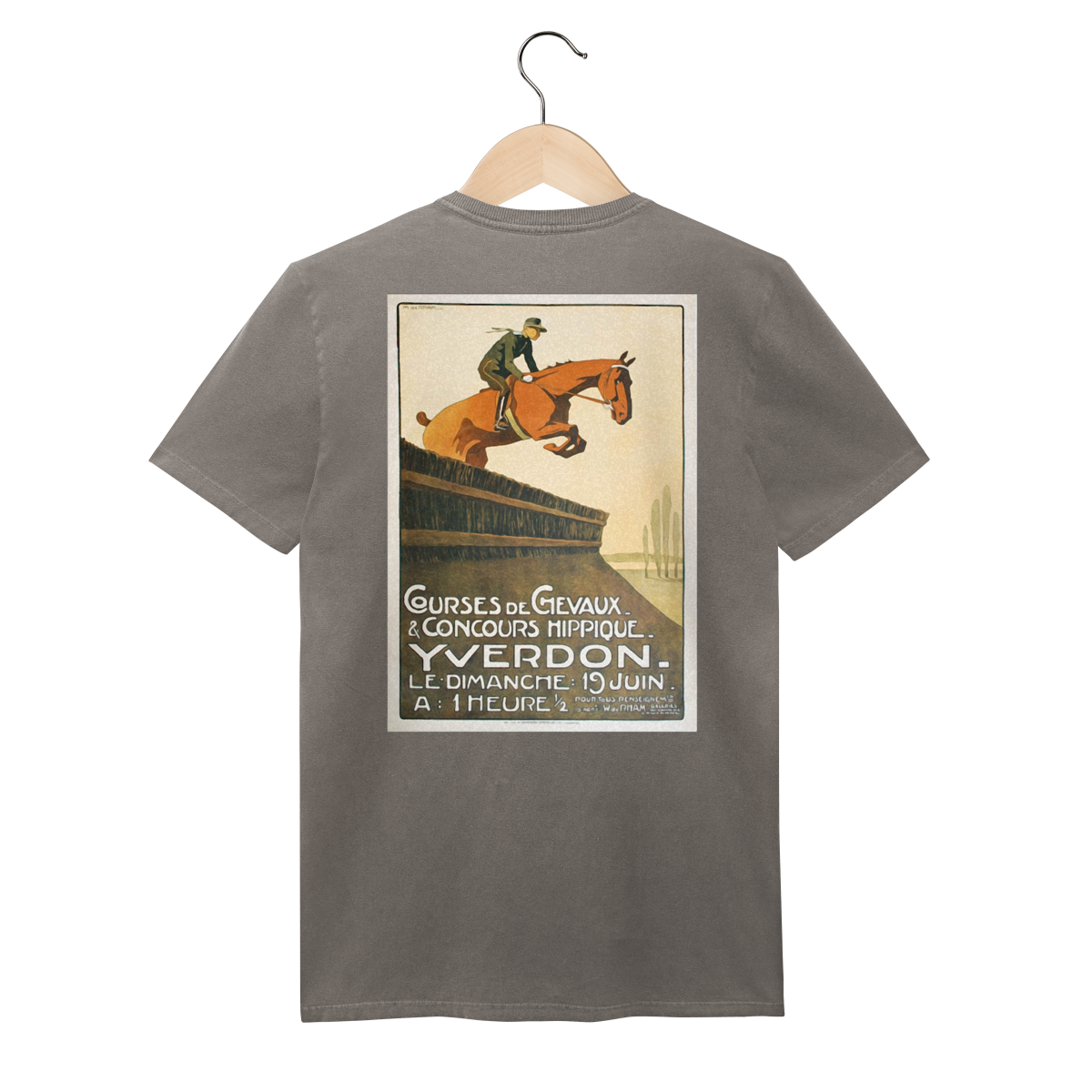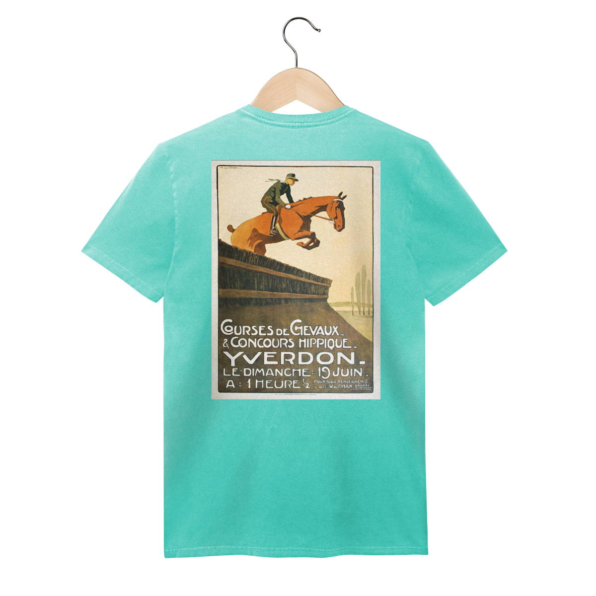 Reviva o charme das competições equestres clássicas com a camiseta “Courses de Chevaux”, inspirada em um pôster francês de hipismo do início do século XX.