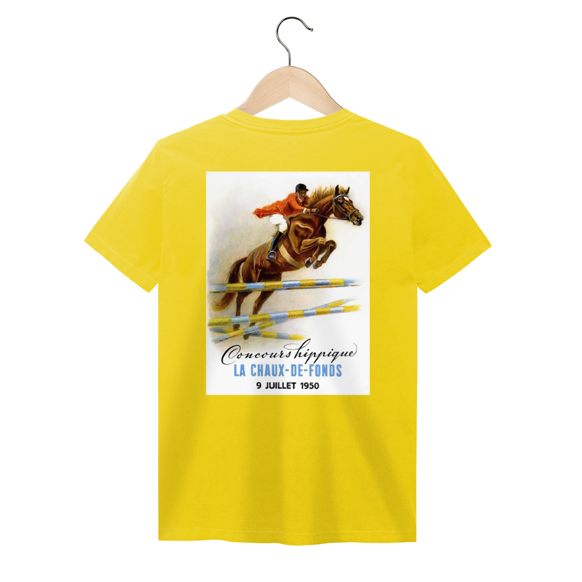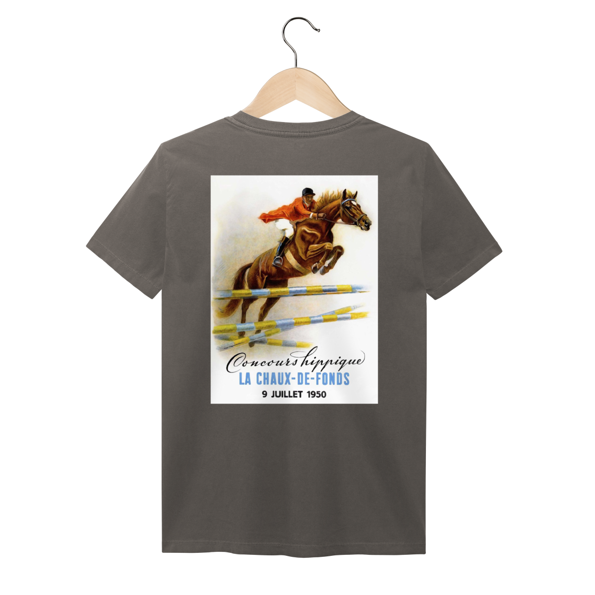 A camiseta Concours Hippique La Chaux-de-Fonds 1950 traz uma ilustração vintage exclusiva, inspirada nos cartazes clássicos de competições de hipismo. A arte retrata um cavaleiro e seu cavalo em pleno salto, transmitindo toda a emoção e elegância do esporte equestre. Ideal para amantes do hipismo, colecionadores de arte retrô e apaixonados por moda equestre, essa peça combina história, estilo e conforto, sendo perfeita para uso casual ou para marcar presença em eventos hípicos.