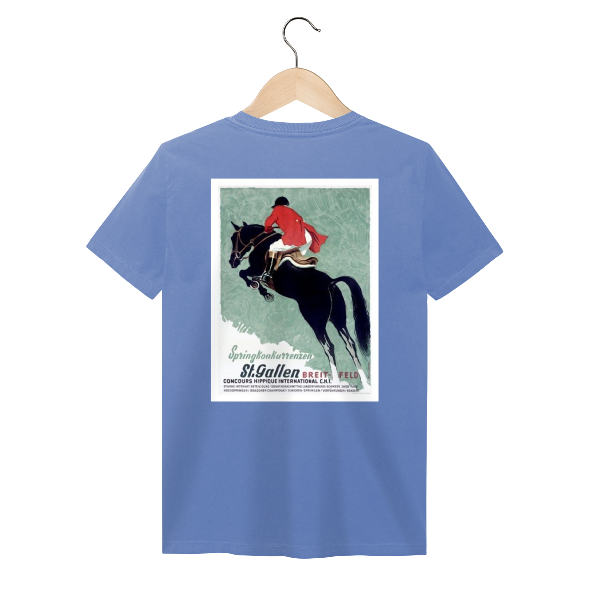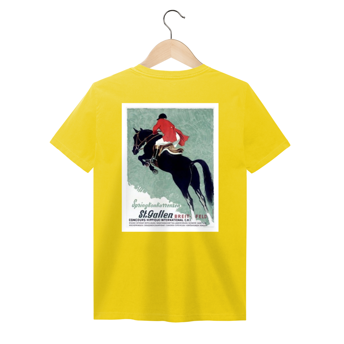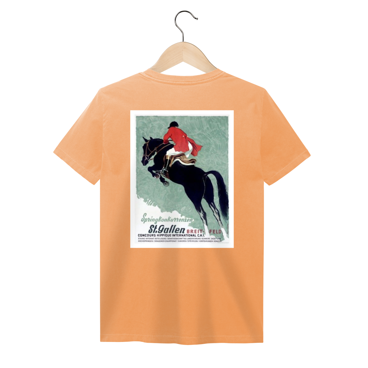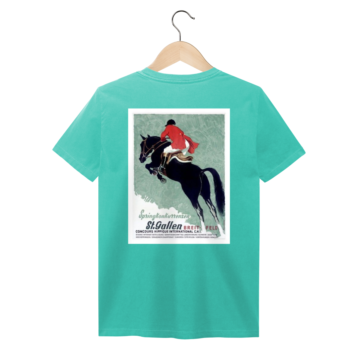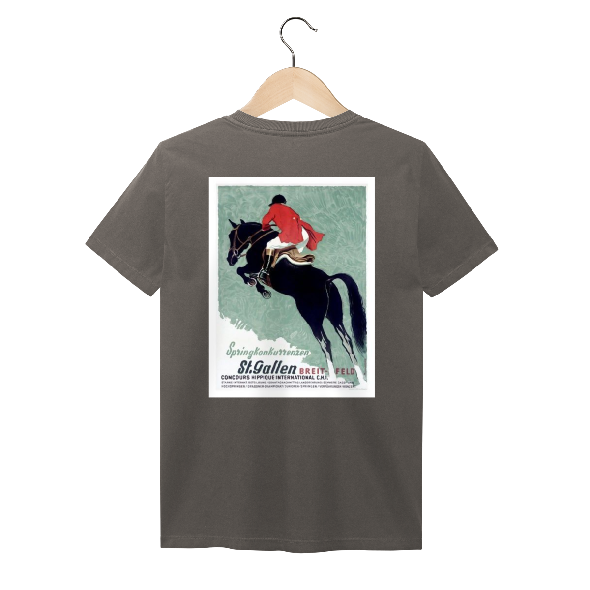 A camiseta St. Gallen Concours Hippique International apresenta um visual vintage sofisticado, retratando um cavaleiro de casaca vermelha e seu cavalo em pleno salto. Uma peça para apaixonados por competições equestres e por camisetas que unem moda e história.