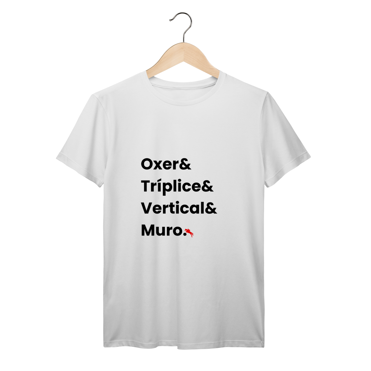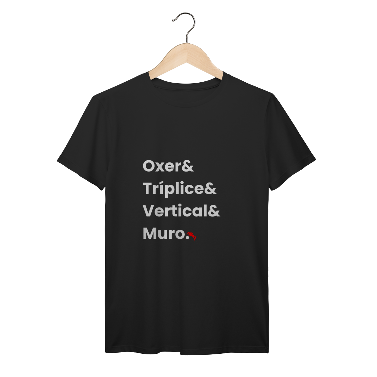 A camiseta Oxer& Tríplice& Vertical& Muro. é uma homenagem minimalista e moderna aos principais obstáculos do salto equestre. Com tipografia marcante, fundo preto elegante e o detalhe de um cavaleiro vermelho em pleno salto, essa peça é perfeita para quem vive a paixão pelo hipismo. Ideal para uso casual ou para marcar presença em eventos equestres, ela une estilo, conforto e identidade esportiva.
